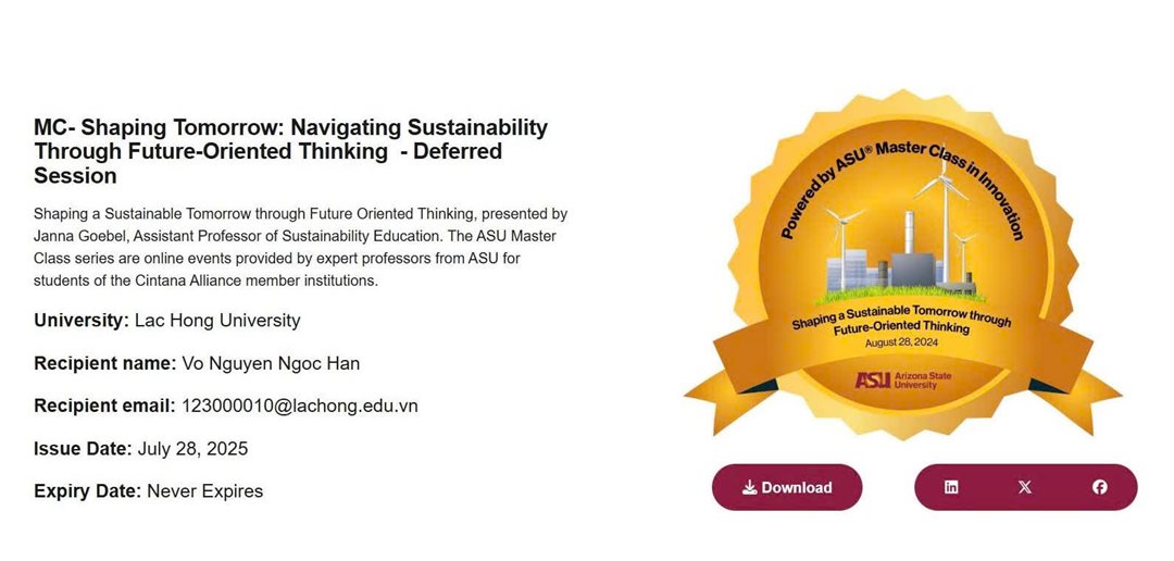 Các bạn sinh viên Trường Đại học Lạc Hồng vừa chính thức nhận hơn 270 digital badge – chứng nhận kỹ năng quốc tế từ Đại học Bang Arizona (ASU – Trường Top 1 về đổi mới sáng tạo tại Hoa Kỳ) sau khi hoàn thành các khóa học của chương trình ASU Master Class đợt Hè 2025.