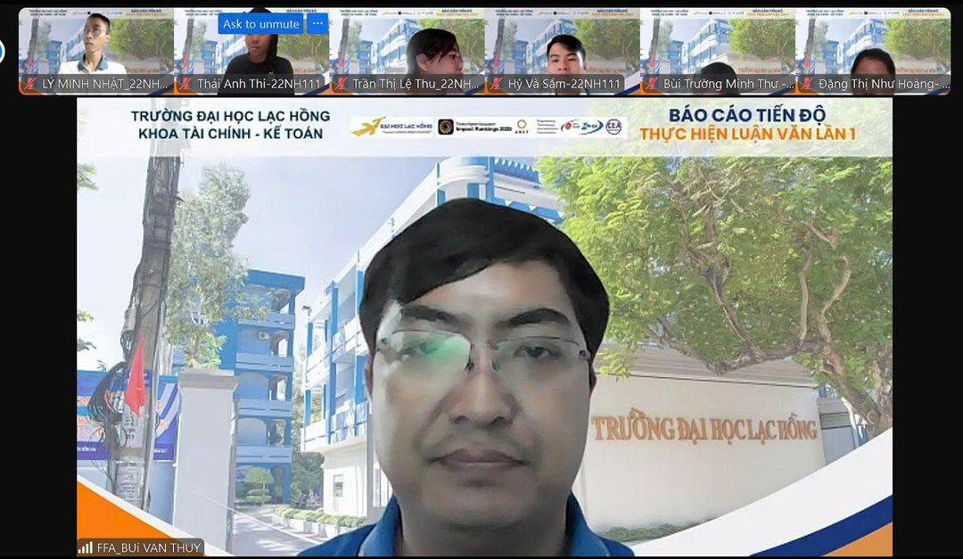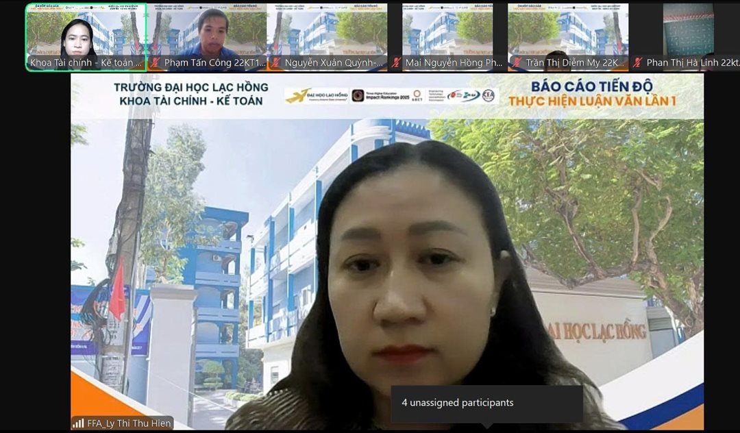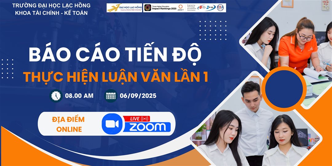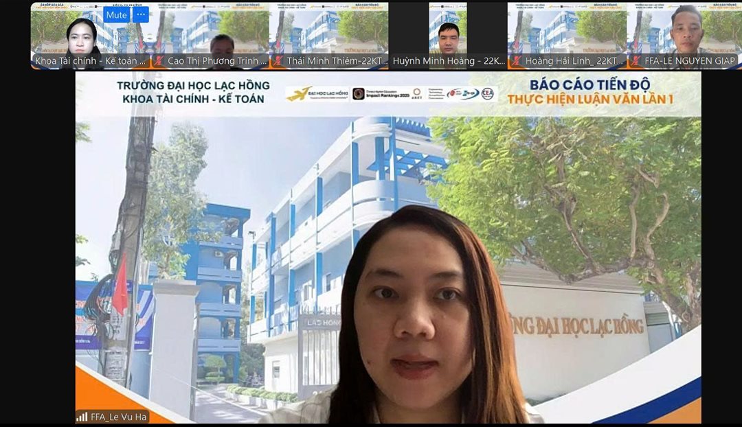Sáng thứ Bảy, ngày 06/9/2025, Khoa Tài chính – Kế toán, Trường Đại học Lạc Hồng đã tổ chức buổi Báo cáo tiến độ thực hiện luận văn (lần 1) cho sinh viên các lớp 22KT111, 22KT112, 22NH111 và 22LG111. Chương trình được tổ chức theo hình thức trực tuyến qua Zoom, với sự tham gia đông đủ của giảng viên hướng dẫn, hội đồng đánh giá và sinh viên.