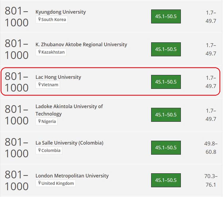 Năm 2025, Trường Đại học Lạc Hồng là một trong 16 cơ sở giáo dục đại học tại Việt Nam có mặt trong bảng xếp hạng bền vững THE Impact Rankings do Tạp chí Times Higher Education công bố. Thành tích này cho thấy nỗ lực của Phòng Khảo thí và Đảm bảo chất lượng trong việc đề xuất chiến lược, định hướng chuyên môn và hỗ trợ các hoạt động gắn với các mục tiêu phát triển bền vững (SDGs) của Liên Hợp Quốc.