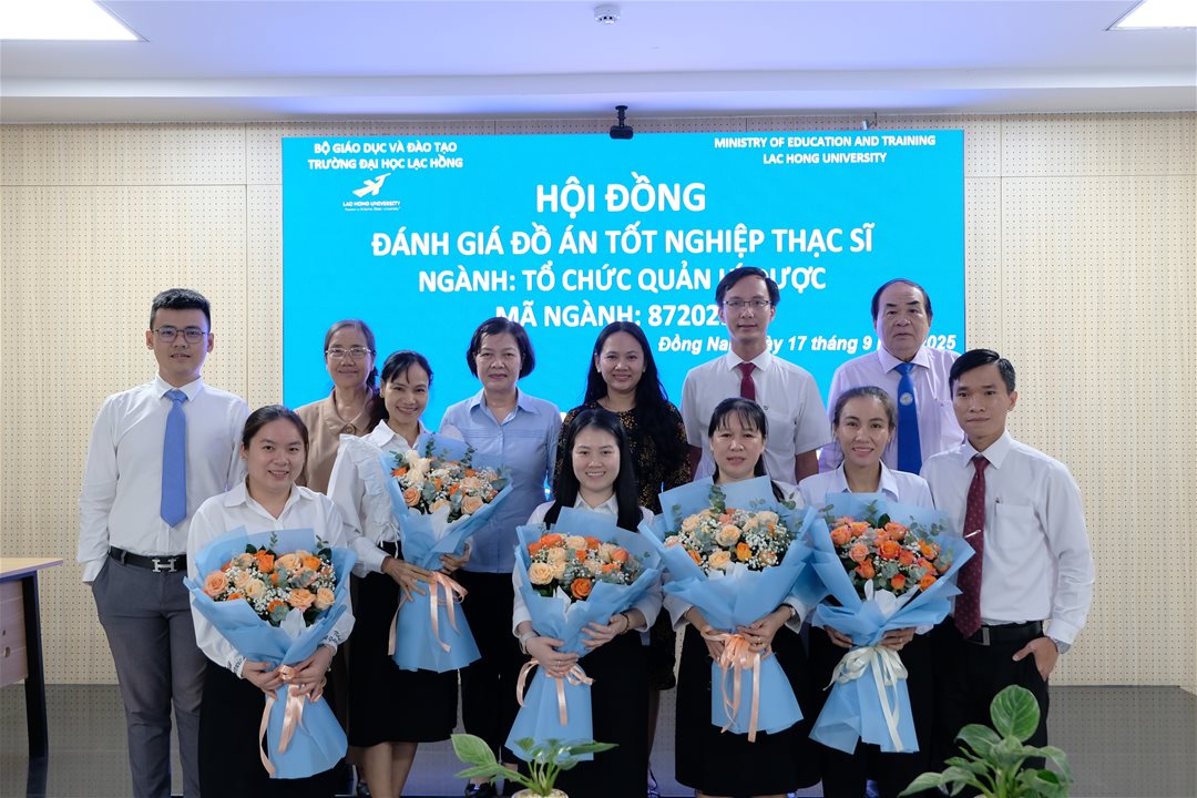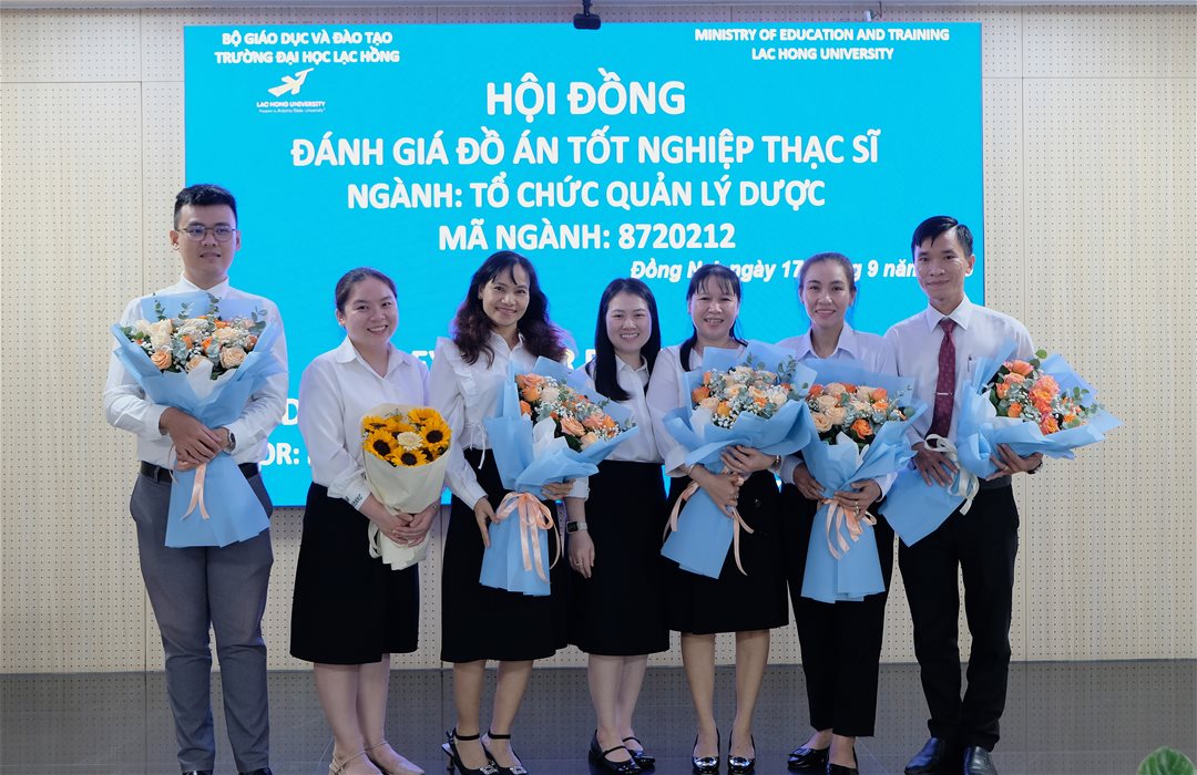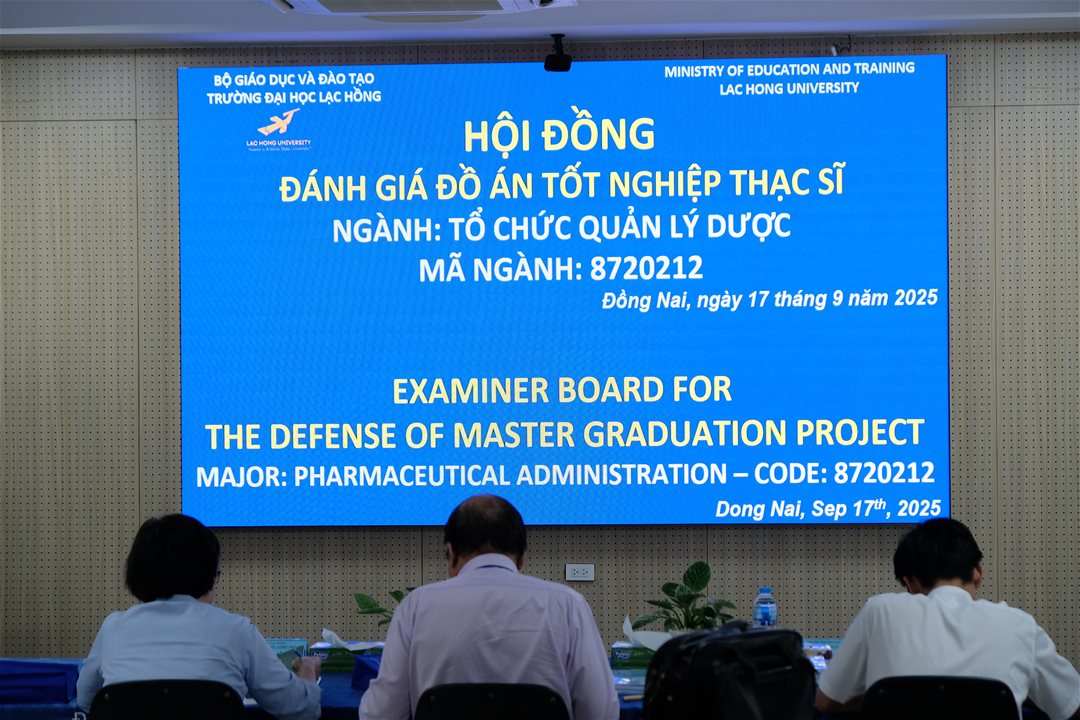 On September 17, 2025, at Room B203, Campus 1 of Lac Hong University (LHU), seven Master’s students of the Pharmaceutical Management programme successfully completed and defended their graduation projects. The defense took place in a solemn and scholarly atmosphere, marking an important milestone in the students’ academic and research journey.